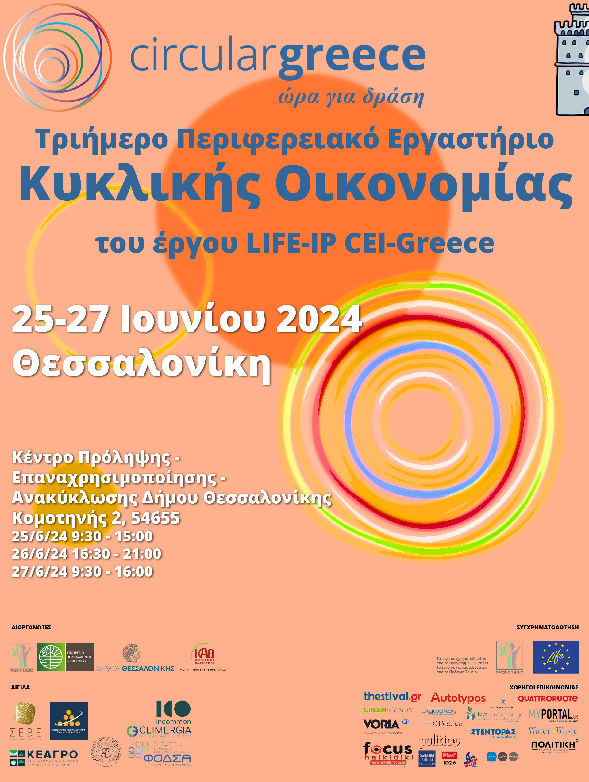 Το Πράσινο Ταμείο, το Υπουργείο Περιβάλλοντος και Ενέργειας (ΥΠΕΝ), ο Δήμος Θεσσαλονίκης και η Κεντρική Αγορά Θεσσαλονίκης Α.Ε. (ΚΑΘ) συνδιοργανώνουν και σας προσκαλούν στο«Περιφερειακό Εργαστήριο Κυκλικής Οικονομίας», από τις 25 έως και τις 27 Ιουνίου 2024, στη Θεσσαλονίκη(Κέντρο Πρόληψης – Επαναχρησιμοποίησης - Ανακύκλωσης Δήμου Θεσσαλονίκης, Κομοτηνής 2, ΤΚ 54655), στο πλαίσιοτου ΈργουLIFE-IP CEI-Greece– LIFE18 IPE/GR/000013 «Εφαρμογή της Κυκλικής Οικονομίας στην Ελλάδα».
